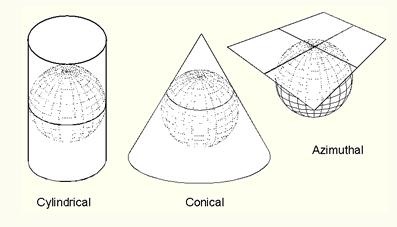 The three classes of map projections are cylindrical, conical and azimuthal.The earth's surface projected on a map wrapped around the globe as a cylinder produces the cylindrical map projection. Projected on a map formed into a cone gives a conical map projection. When projected on a planar map it produces an azimuthal or zenithal map projections.