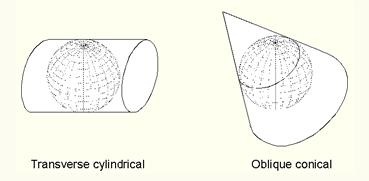 A transverse cylindrical and an oblique conical map projection. Both are tangent to the reference surface