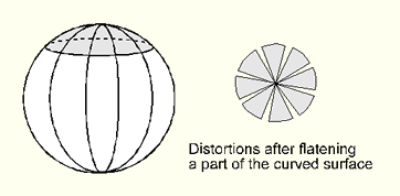 The transformation from the curved reference surface of the earth to the flat plane of the map is never completely successful. Look at the diagram below. By flattening the curved surface of the sphere onto the map the curved surface is stretched in a non-uniform manner.