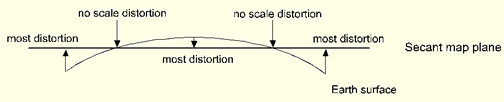 The distortions increase as the distance from the central point of the projection increases. Placing the map plane so that it intersects the reference surface will reduce and mean out the scale errors.